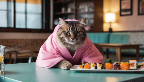 A fashionable cat in a pink robe enjoying sushi in a cozy restaurant setting during a leisurely afternoon