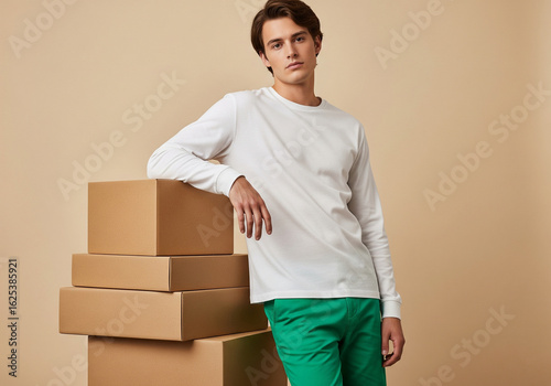 A fashionable young man in a white long-sleeve t-shirt and green pants leans on a stack of cardboard boxes, showcasing modern casual wear and delivery services.