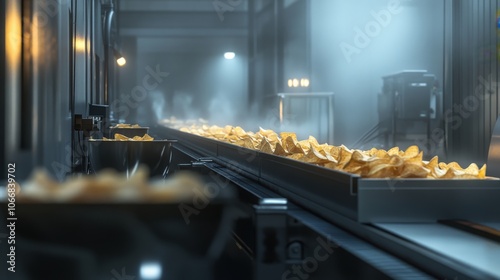 A fast conveyor belt transports freshly fried snacks through a production line in a lively factory setting. The steam and motion create a dynamic atmosphere