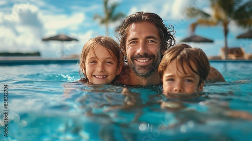 A Father And Children Swim In A Transparent Pool. Illustration On The Theme Of Recreation And Tourism, Family Happiness. Generative AI
