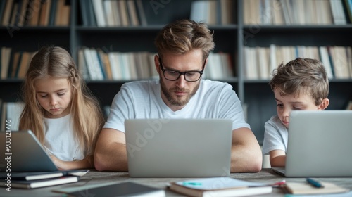 A father sits with his two children at a table, assisting them with their online learning. The cozy study includes shelves lined with books and they are focused on their laptops