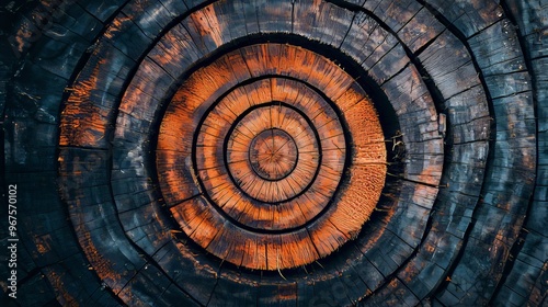 A felled oak tree stump or trunk with details of its organic texture and warm dark brown tones. Close-up of end grain of the trunk.