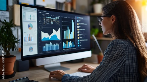 A female analyst works with an information database to analyze marketing and sales data using a business analytics dashboard that includes charts metrics and KPIs
