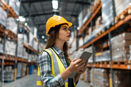 A female employee or supervisor checks the stock inventory on a digital tablet as part of a smart warehouse management system