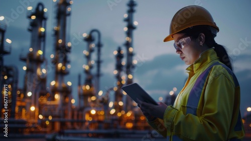A female engineer in a hard hat and safety glasses checks data on a tablet in front of a lit-up oil and gas refinery at night