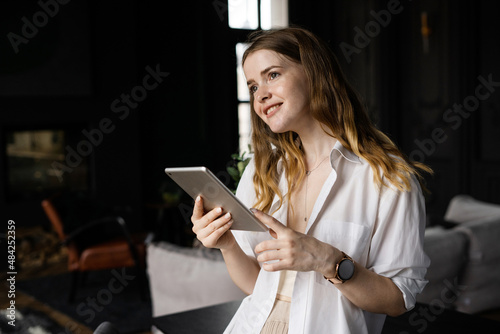 A female freelance designer works in a hotel workplace uses a tablet, communicating with a client.