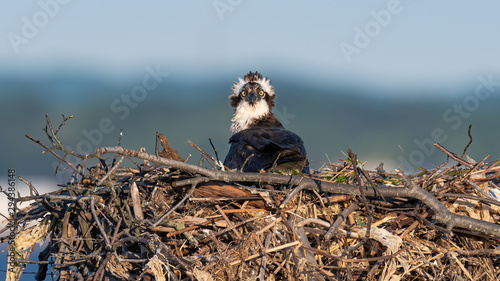 A female Osprey incubating eggs in a nest.