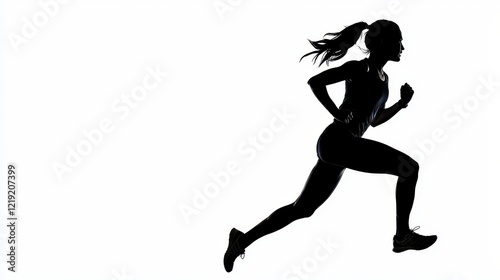 A female runner sprinting, with her body positioned in perfect form, on a white isolated background