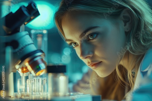 A female scientist intently examines samples under a microscope in a laboratory setting, focused on her research.