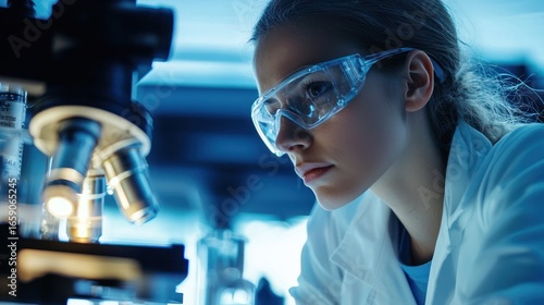 A female scientist wearing protective glasses and a lab coat, examining a sample under a microscope in a laboratory setting.