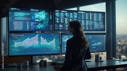 A female senior data scientist is in the monitoring room, reviewing reports from the risk management department on a large digital screen. Employees of a Diverse Consulting Firm Using Desktop Computer