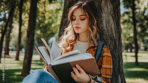 A female student leaning against a tree in a park, reading a book while holding other textbooks in her arm, with a peaceful outdoor campus atmosphere.