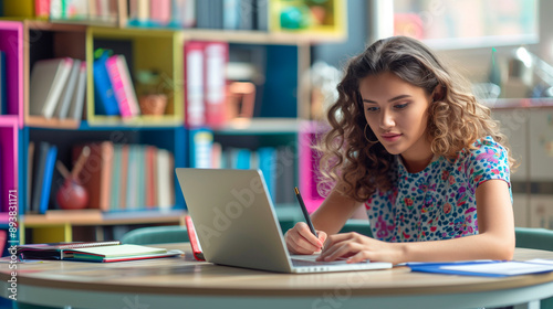 a female student studying for an online certification, using her laptop for course material and writing notes in her notebook, in a modern study space with tech gadgets and educati