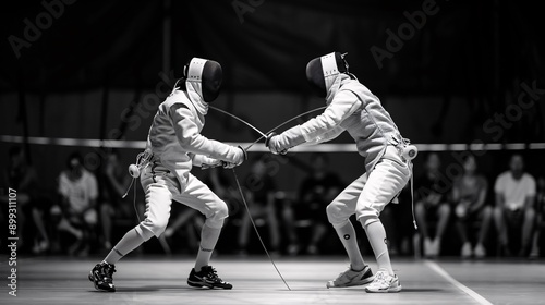 A fencing match in progress, with two fencers in mid-action, swords clashing. The background shows the scoring board and a captivated audience, along with coaches providing guidance