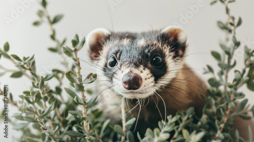 A ferret stands alert in a bush, gazing directly at the camera with curiosity