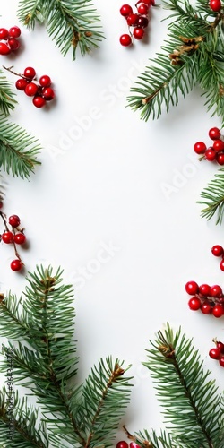A festive arrangement of Christmas decorations, featuring pine branches, red berries, and pine needles, set against a white background.