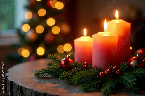 A festive candle holder with lit candles creates a warm ambiance for the holiday season. Focus on depth and mood, emphasize lighting and atmosphere, style should be elegant and high quality. Inclu