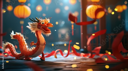 A festive Chinese New Year virtual card with animated elements, such as a dragon dance, firecrackers, and flowing red ribbons