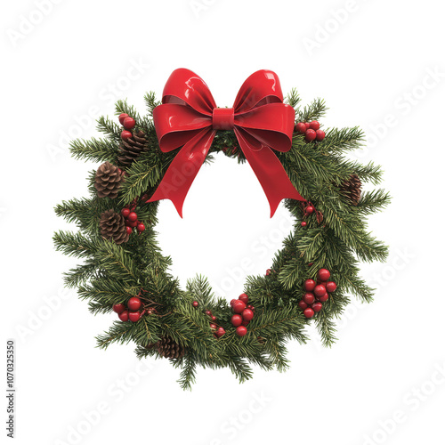 A festive Christmas wreath adorned with a red bow, pine cones, and red berries, conveying a warm holiday spirit., isolated on a transparent background.