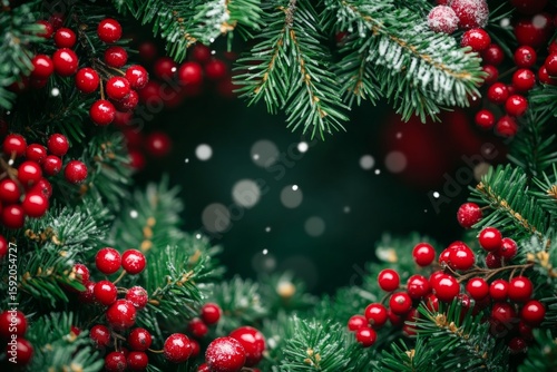 A festive Christmas wreath made with evergreen branches, red berries and illuminated by twinkling lights in a blurred background.