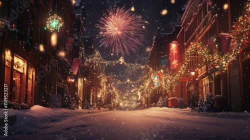 A Festive City Street Covered in Snow with Fireworks in the Sky