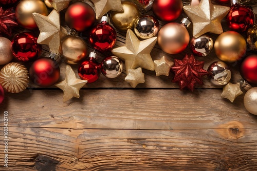 A Festive Collection of Red and Gold Christmas Ornaments Arranged on Rustic Wood