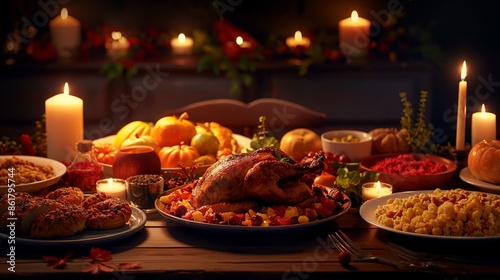 A festive dinner table showcases a variety of holiday dishes, including a roasted turkey, surrounded by candles and seasonal decorations, ready for celebration.