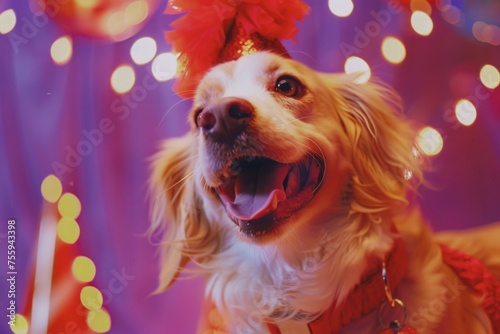 A festive dog wearing a party hat with colorful lights in the background. Perfect for celebrating special occasions.