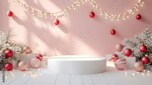A festive holiday scene featuring a pink themed background, snowy branches, and hanging ornaments. The setting is complemented by a warm glow of string lights and a white platform.
