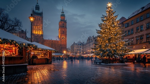 A festive holiday scene in Krakow, Poland, with the Cloth Hall and a beautifully lit Christmas tree on the Main Market Square, capturing the spirit of Christmas.