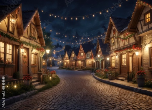 A festive holiday village with lights and decorations, Christmas trees, twinkling string lights, festive window displays