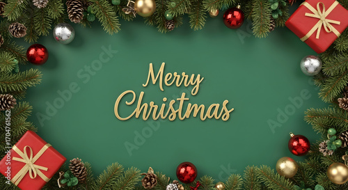A festive merry christmas message is displayed on a green surface surrounded by christmas ornaments, pine branches, and wrapped gifts