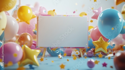A festive scene with balloons, stars, and a blank canvas for creative expression.