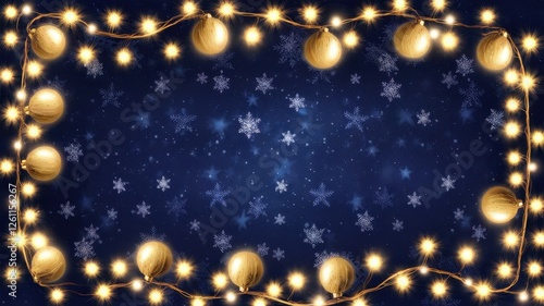 A festive winter background featuring golden ornaments and twinkling fairy lights against a deep blue backdrop with falling snowflakes.