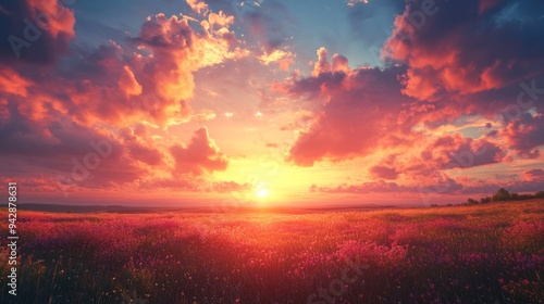 A field of flowers with a beautiful sunset in the background