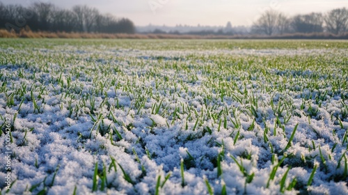 A field of green grass partially covered with fresh snow in a serene winter landscape.