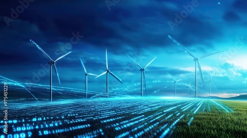 A field of wind turbines with their blades made of digital data streams, symbolizing the role of technology in advancing renewable energy