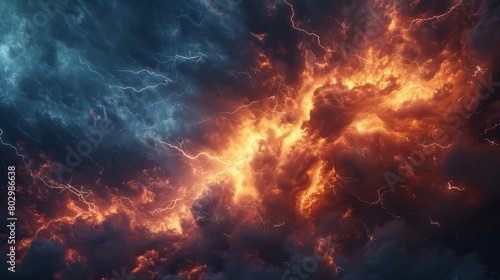A fiery, colorful cloudscape with a blue and orange sky. The sky is filled with clouds and the colors are vibrant and intense