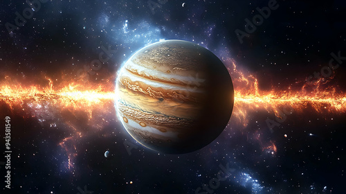 A fiery cosmic event as a large planet with brown and white bands passes in front of a galaxy with glowing orange and white bands of light.