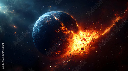 A fiery explosion tears through a planet, leaving a trail of debris in its wake.