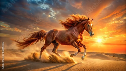 A fiery horse with a flowing mane gallops through a desert landscape, illuminated by the golden glow of a setting sun, casting long shadows across the dunes.