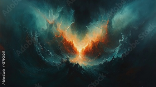 A fiery orange light breaks through a dark, cloudy sky, creating a dramatic and otherworldly scene.