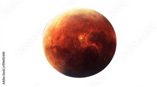 A fiery red Mars-like planet with rugged terrain and deep craters, isolated on a simple white backdrop