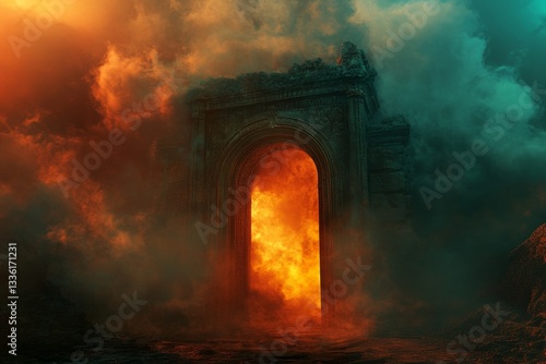 A Fiery, Ruined Archway to an Unseen Realm A Portal of Destruction and Unknown Destinies