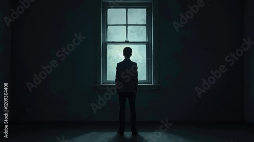A figure standing in front of a closed window in a dimly lit room, staring out into darkness, with only a faint light from outside illuminating the scene.