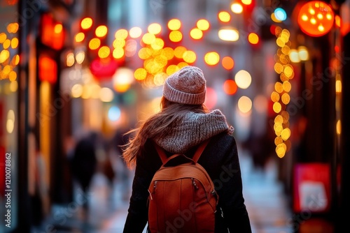 A figure walking along a quiet street lined with closed shops and dimly lit signs at dusk