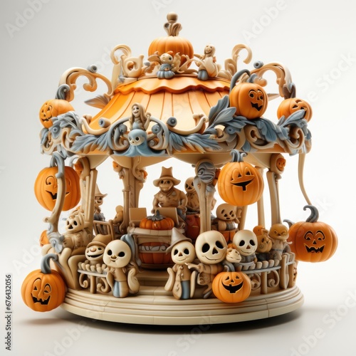 A figurine of a carousel with pumpkins and skeletons.
