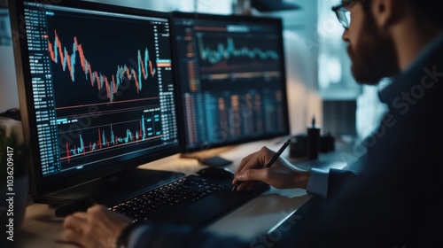A financial analyst at their desk, reviewing stock market charts and graphs, Financial office scene