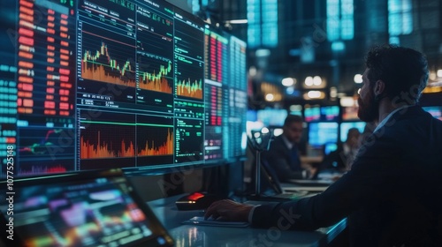 A financial analyst monitors market trends and data visualizations in a trading room setting