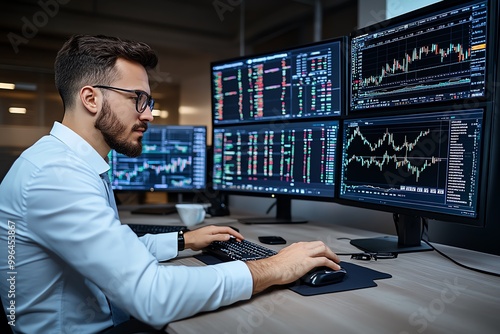 A financial analyst working on a computer, analyzing stock market data on multiple screens in a modern office